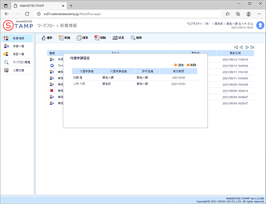 自身が長期出張等で不在になる場合、代理人を設定しておくことで委託された人が申請・承認をすることができます。